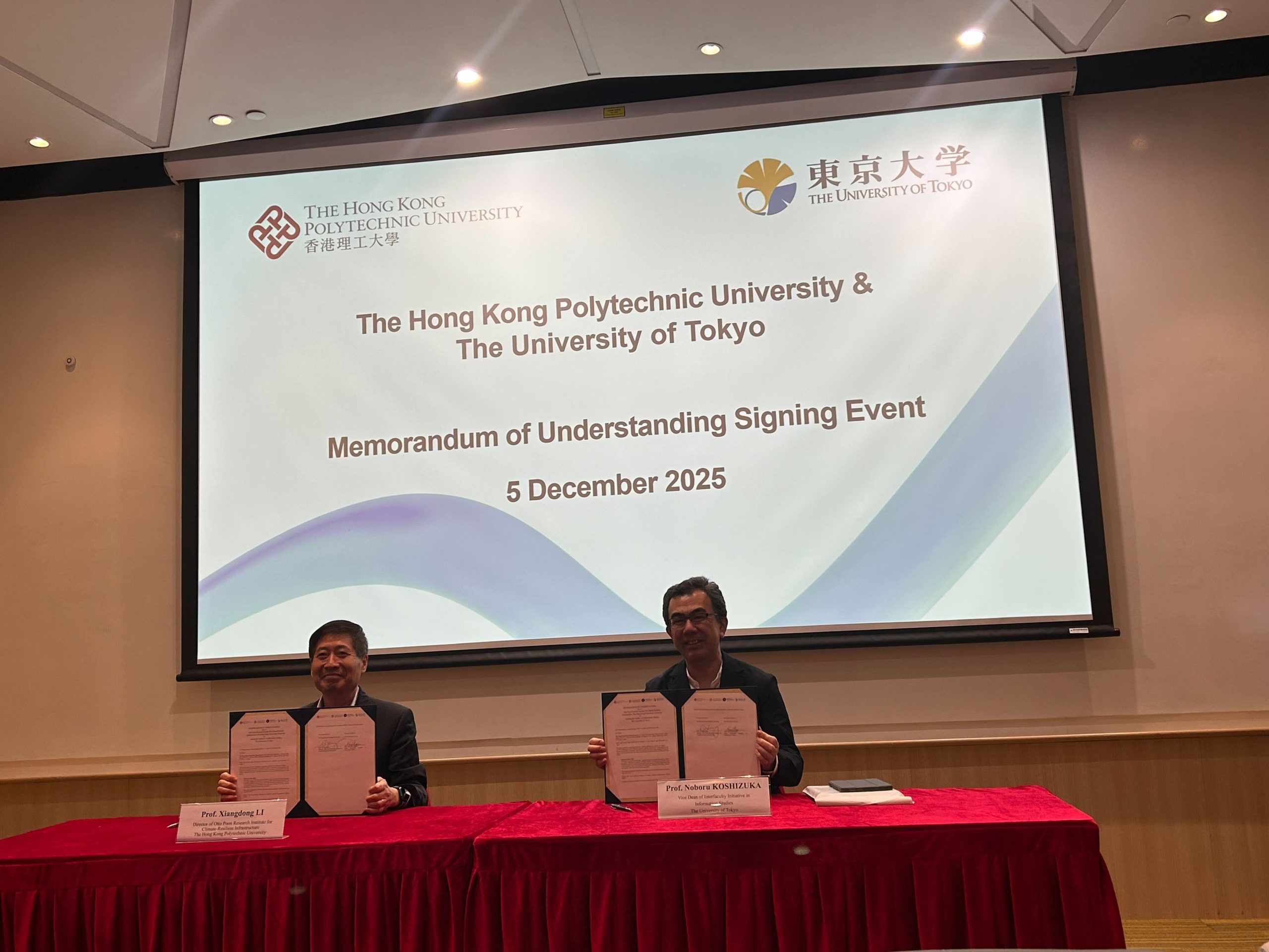 東京大学大学院情報学環は、香港理工大学 オットー・プーン・クライメート・レジリエント・インフラストラクチャー・リサーチ・インスティテュート(Otto Poon Research Institute for Climate-Resilient Infrastructure (RICRI))と2025年12月5日に、香港理工大学キャンパスにおいて学術交流協定を締結いたしました。締結式には、情報学環からは越塚登 副学環長が出席し、香港理工大学RICRIからは創設者であるOtto Poon博士及び所長のLI Xiang-dong教授らが出席しました。今後、国際的かつ地域横断的な共同研究を推進し、気候適応、都市防災、インフラレジリエンス分野で革新的な研究解決策を創出し、国際的知見創出に貢献いたします。具体的には、定期的なセミナーやワークショップ、研究者・学生の相互交流を通じて知識共有を深化させ、東京及び香港における現場でのインフラーレジリエンスに関する実践的な研究・調査を促進いたします。協定の締結式は、香港理工大学に新しく設立されたSKL-CRCC(State Key Laboratory-Climate Resilience for Coastal Cities)の設立記念シンポジウムとともに実施され、当シンポジウムでは、副学環長 越塚登教授が、“Urbanetics: Building Ecological Intelligence in Cities through Artificial Intelligence and Data”というタイトルで招待講演を行った。