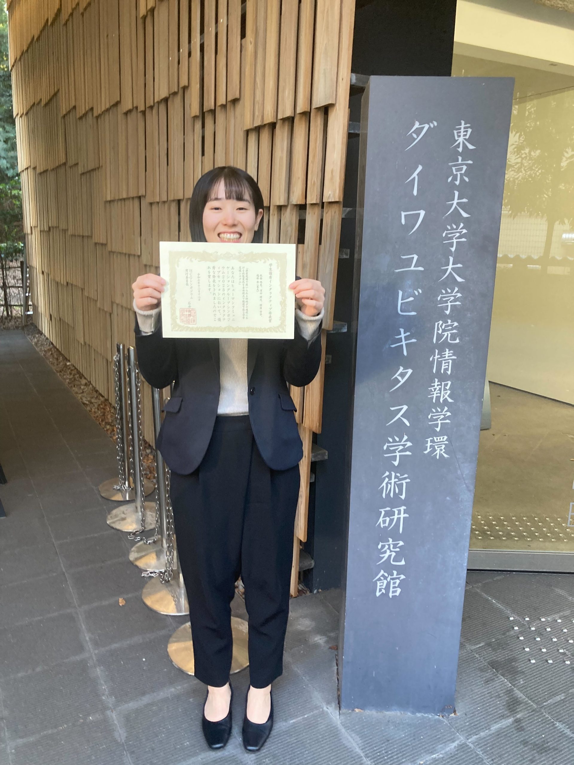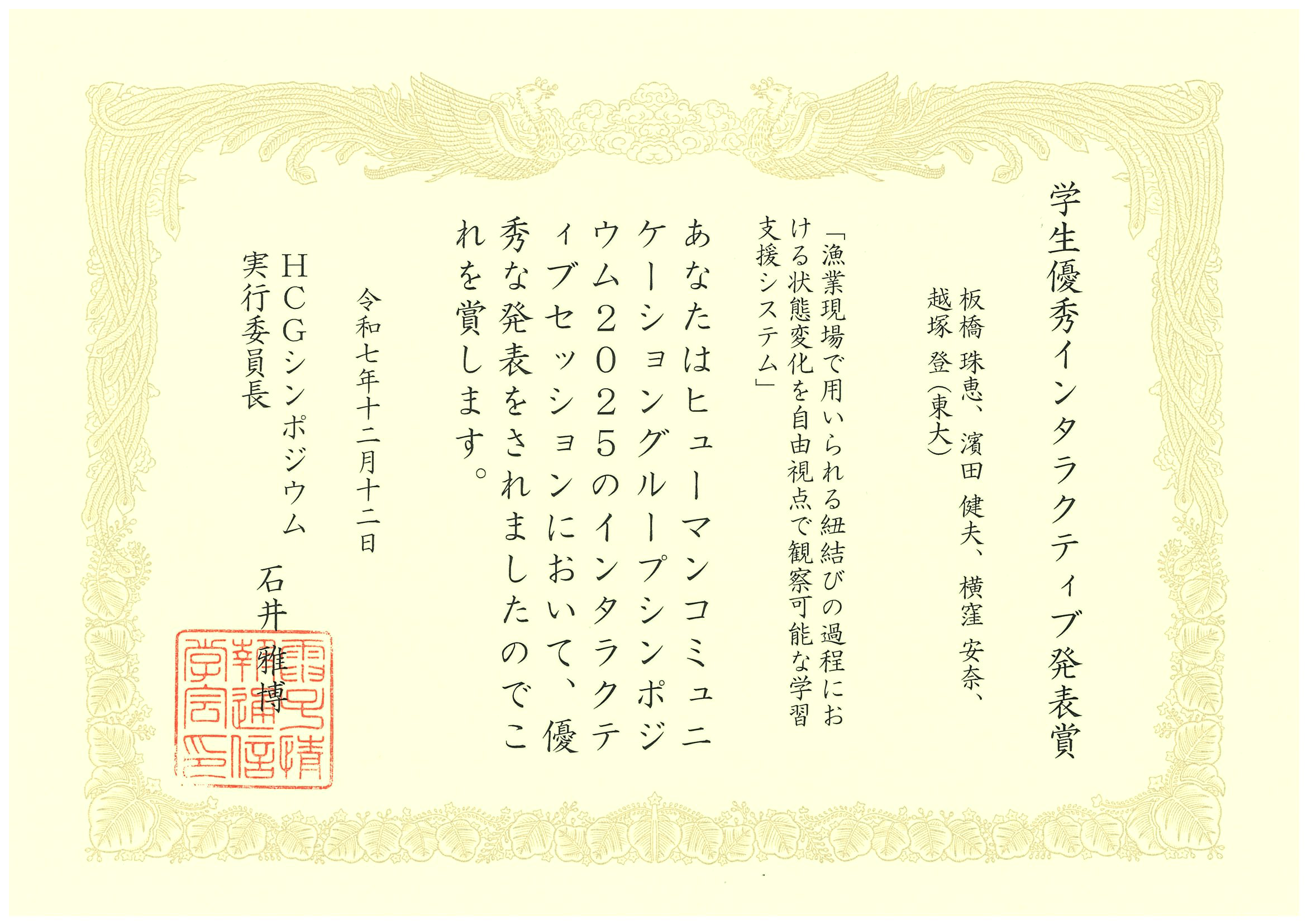 2025年12月10日(水)〜2025年12月12日(金)に福岡県北九州市にて開催された「HCGシンポジウム2025」において、板橋珠恵さん(総合分析情報学コース修士2年・越塚研究室)が「学生優秀インタラクティブ発表賞」を受賞しました。